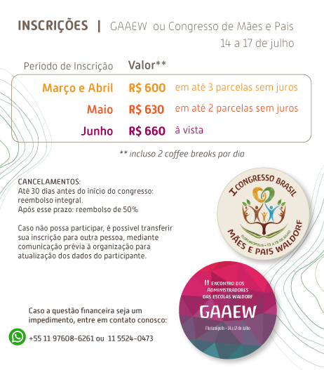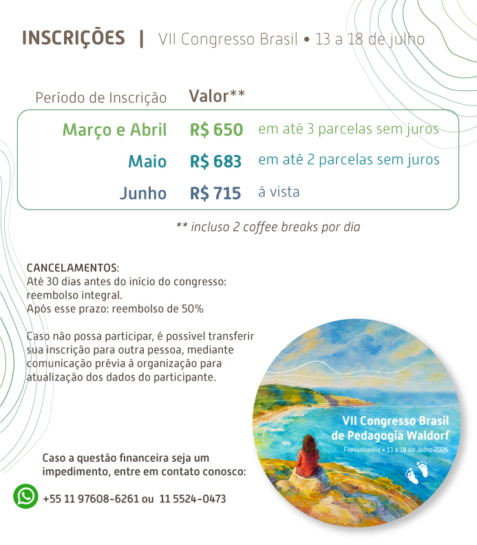 VII Congresso Brasil de Pedagogia Waldorf MISSÃO DO EVENTO O VII Congresso Brasil de Pedagogia Waldorf tem como missão, aproximar o diálogo entre a Pedagogia Waldorf e os desafios contemporâneos da educação brasileira, promovendo o aprofundamento da interlocução com o meio acadêmico, sem perder a especificidade da abordagem antroposófica; promover a postura investigativa dos docentes Waldorf; fortalecer os encontros sociais que abordem, de forma aberta e sensível, temas como: diversidade étnica-cultural e inclusão, aprofundando o tema central, que rege a Pedagogia Waldorf, ou seja, a fenomenologia, em todas as áreas de ensino, trazendo à luz, no centenário da Educação Infantil, as suas reverberações no desenvolvimento infanto-juvenil, no Ensino Fundamental e Médio. OBJETIVOS: • Promover o intercâmbio de experiências entre escolas Waldorf de diferentes regiões do Brasil, com ênfase em práticas pedagógicas enraizadas nos contextos locais; • Estreitar laços com as universidades públicas do nosso país, a fim de fomentar estudos sobre a obra de Rudolf Steiner; • Fortalecer a rede de educadores, gestores e pesquisadores comprometidos com uma educação humanizadora, inclusiva e sustentável; • Aproximar os docentes da forma de fazer ciência de caráter fenomênico • Valorizar iniciativas que dinamizam a vida comunitária na instituição escolar; • Estimular e difundir a pesquisa e a produção acadêmica sobre a Pedagogia Waldorf; • Promover uma reflexão crítica e um diálogo sobre as práticas pedagógicas Waldorf. PÚBLICO-ALVO: • Educadores Waldorf (professores atuantes ou em formação) • Gestores escolares de instituições Waldorf • Estudantes de pedagogia e áreas afins • Pesquisadores interessados em educação antroposófica • Pais e mães envolvidos com a educação Waldorf • Profissionais da saúde e terapeutas ligados à Antroposofia • Representantes de instituições públicas e privadas, interessadas na Pedagogia Waldorf • Pessoas interessadas em educação inclusiva, diversidade cultural, sustentabilidade e desenvolvimento humano integral